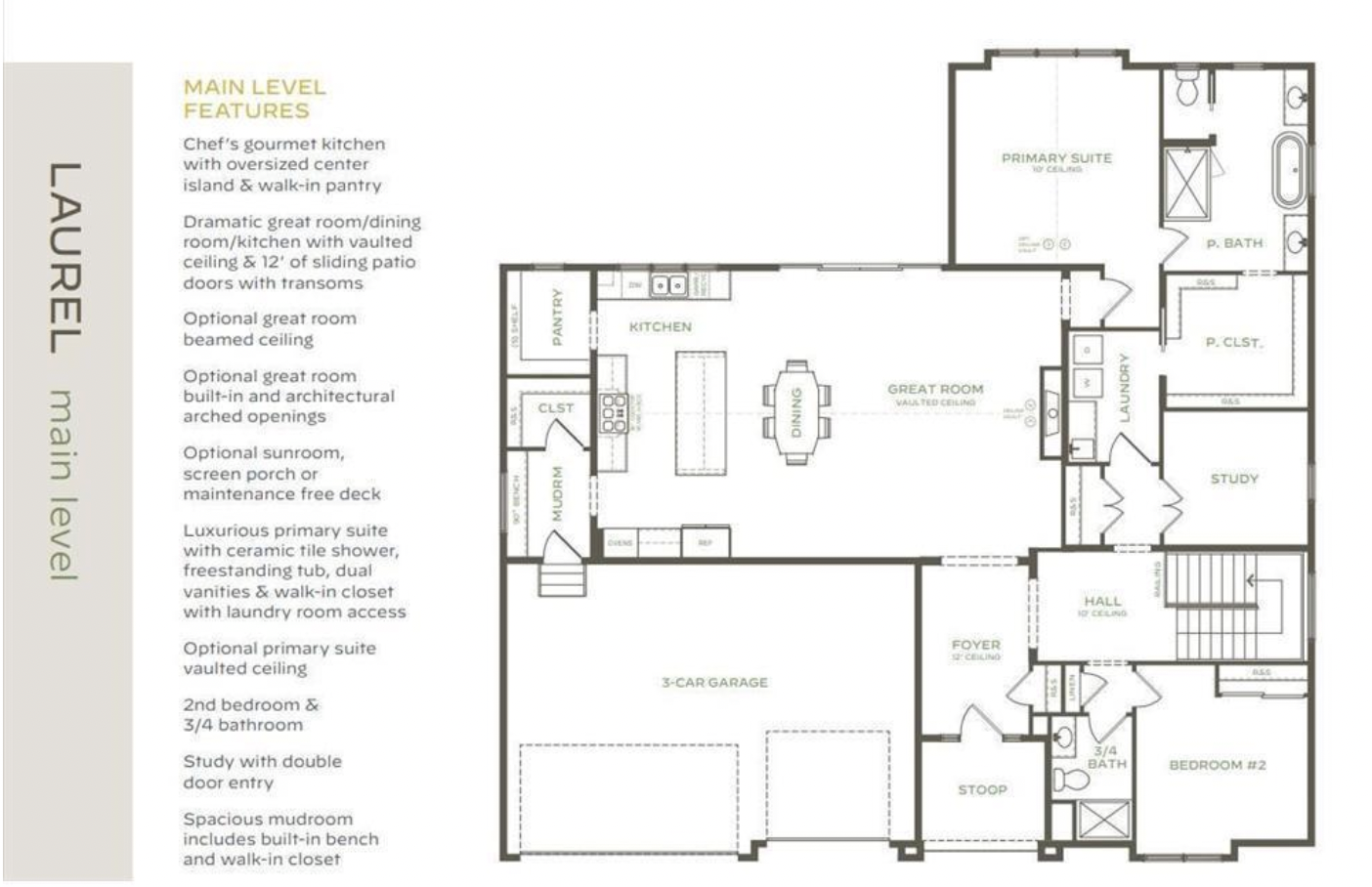 The private primary suite is designed as a true retreat with a ceramic tile shower, freestanding soaking tub, dual vanities, and a spacious walk-in closet with direct access to the laundry room. An optional vaulted ceiling adds an additional architectural statement. The main level also includes a second bedroom, a ¾ bath, and a study with double-door entry—perfect for a home office or quiet workspace—along with a mudroom featuring built-in bench seating and a walk-in closet.