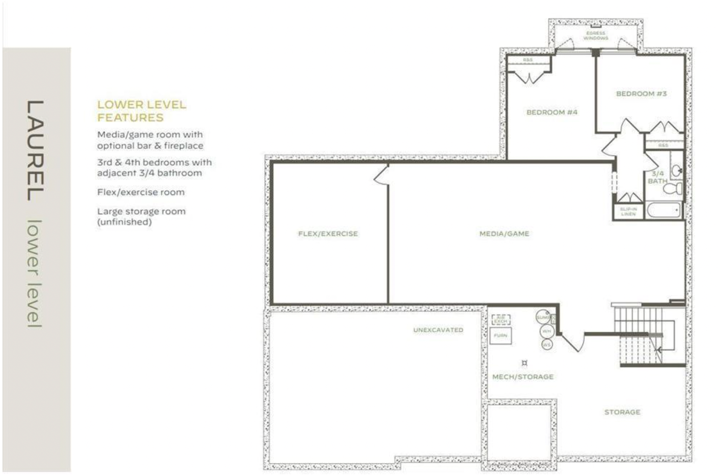 The finished lower level expands the home’s entertaining potential with a large media and game room, with options for a bar and fireplace—creating the perfect space for hosting friends, relaxing, or enjoying game day.